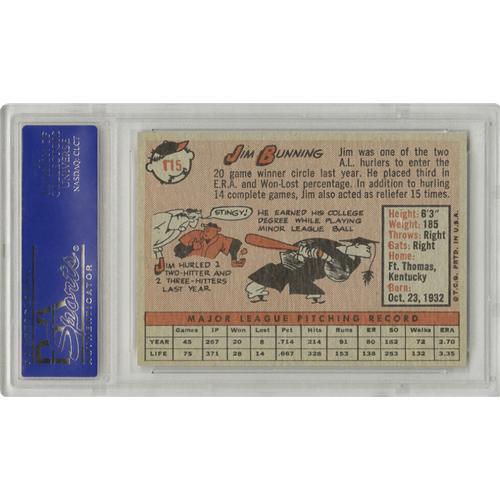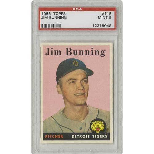 <B>1958 Topps Jim Bunning #115 PSA Mint 9.</B></I> This Hall of Famer and Republican Senator from Kentucky has never looked better than he does on this essentially pristine card from the '58 set. Only two other examples have ever equalled the one you see here, and not a single example has beaten it. Terrific color, gloss, registration and corners are the keys to its success. <BR><BR><B>Important notice:</B> Heritage usually auctions material at the rate of 200-250 lots per hour. On some occasions eBay Live bid software or the Internet may not be able to keep up with the pace of the auction. We recommend placing a realistic absentee bid now as insurance to avoid disappointment. Occasionally the auctioneer may eliminate or reject an eBay Live bid, and the auctioneer may also reopen a lot after the close of the eBay live bidding (usually because we missed an audience bid), and may reject your bid even if it shows you as the winning bidder. By bidding via eBay Live, you agree that Heritage may award the lot to another bidder at its sole discretion under the circumstances described above or any other reasonable circumstances. Since eBay bids are not shown to us until we open the lot on the floor, we treat those bids just like floor bids. In most cases the floor responds before the eBay bid is presented to us, due to Internet lag time, so for consistency we have made it a policy that floor bids are always considered first over tie eBay live bids. Also please note that all Heritage lots purchased through eBay Live carry a 22.5% Buyer's Premium. Please make sure you read the Terms and Conditions before you bid. This lot is being auctioned in conjunction with a live floor auction by Heritage Galleries & Auctioneers. All final auction and invoice information will be supplied by Heritage Galleries & Auctioneers, and all other information should be considered preliminary. Lot:19577 <BR><BR><B>Winning Notification and Billing:</B> After the FINAL session in this auction is complete, Heritage will send e-mail and snail mail invoices. This process normally takes several days. All final auction and invoice information will be supplied by Heritage Galleries & Auctioneers, and all other information should be considered preliminary. <BR><BR>This auction will be conducted on a live auction floor and over the Internet through eBay Live. If you choose to place an absentee bid, please take a moment to <font color='#0000ff'><u><a href='http://pages.ebay.com/liveauctions/help/before/laabsentee.html'>learn how eBay Live absentee bidding works</a></u></font><font color='#000000'>
