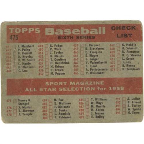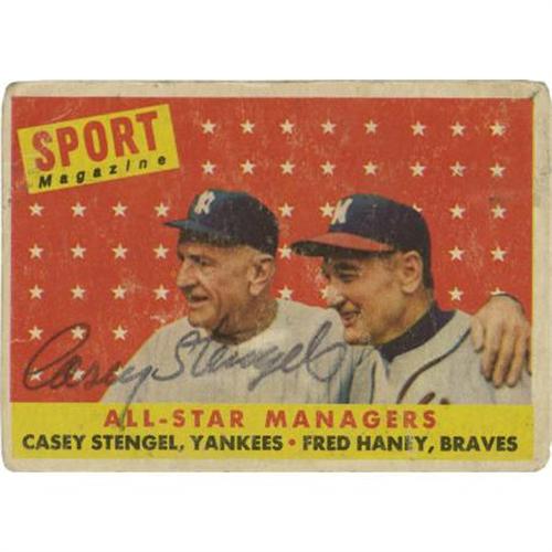 <B>1958 Topps Signed Casey Stengel #475.</B></I> This checklist card from the popular '58 Topps issue features the All-Star managers from the previous season, Casey Stengel and Milwaukee's Fred Haney. The Hall of Fame skipper Stengel has applied a nice example of his signature to the front of this #475 card. <I>LOA from PSA/DNA.</B></I><BR><BR><b>Shipping:</b> Requires 3rd Party Shipping (<a target="_blank" href="http://www.heritageauctions.com/common/shipping.php">view shipping information</a>)
