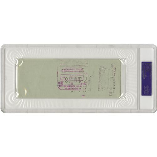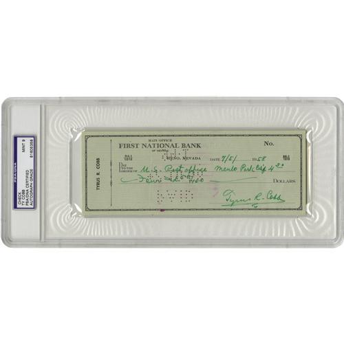 <B>1958 Ty Cobb Signed Check, PSA Mint 9.</B></I> Despite Cobb's reputation for bad behavior, he was quite vigilant in his response to fan mail in his later years, and generous to those seeking his autograph. We assume that this check, made payable to the "U.S. Post Office, Menlo Park Calif," paid for postage in fulfilling these requests. Cobb's favored green ink is in fine form here, rating a consistent and impressive 10/10. Bank stamping and punch coding remains well clear of his beautiful "Tyrus R. Cobb" signature, and a pair of vertical creases are all but invisible. One of the most visually arresting Cobb checks we've seen. Encapsulated by PSA/DNA for protection and unquestioned authenticity.