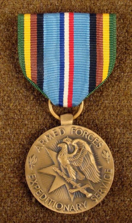 HERE IS A 1958 U.S. ARMED FORCES EXPEDITIONARY MEDAL. IT WAS FOR NON-COMBAT HEROISM AND WAS INITIATED BY JFK. *