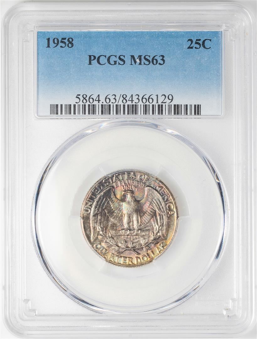 One 1958 Washington Quarter Coin PCGS MS63 Amazing Toning. PCGS Graded.