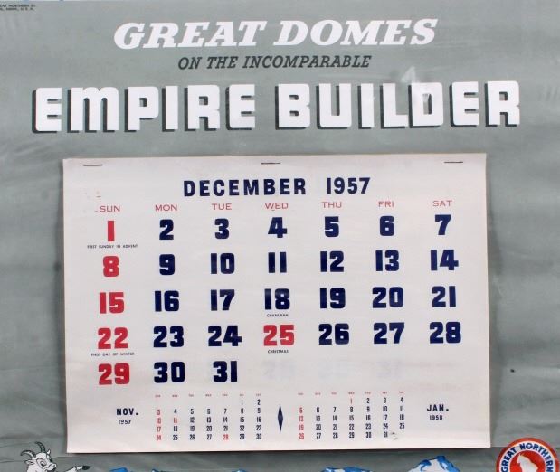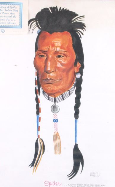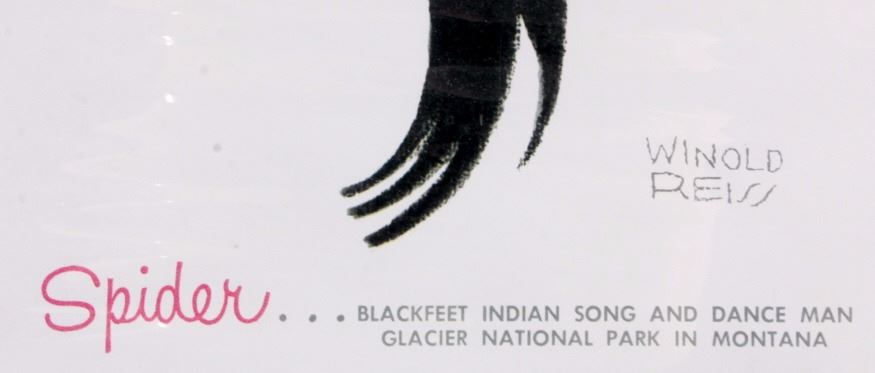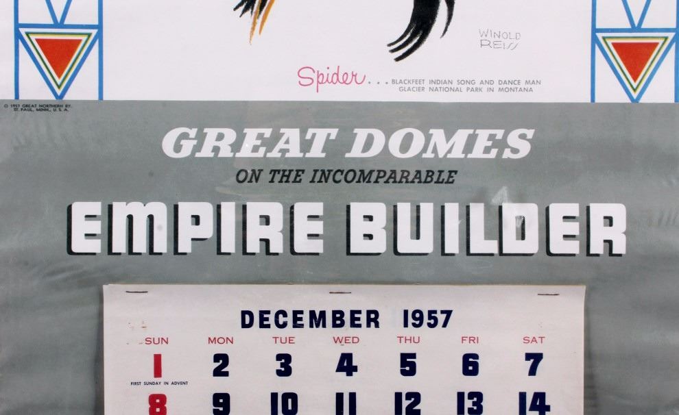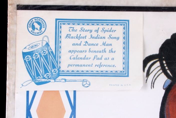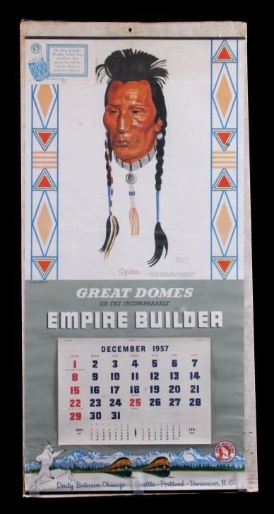 This is an original 1958 Great Northern Railway calendar featuring the artwork of Winold Reiss. The calendar shows "Spider", a Blackfeet Native American Indian. The image was originally painted by Winold Reiss who is well known for his works of the Blackfoot Indians. The calendar is unused and begins with December 1957 and includes all 12 months of 1958. It is in good overall condition. The calendar measures 16" x 33".