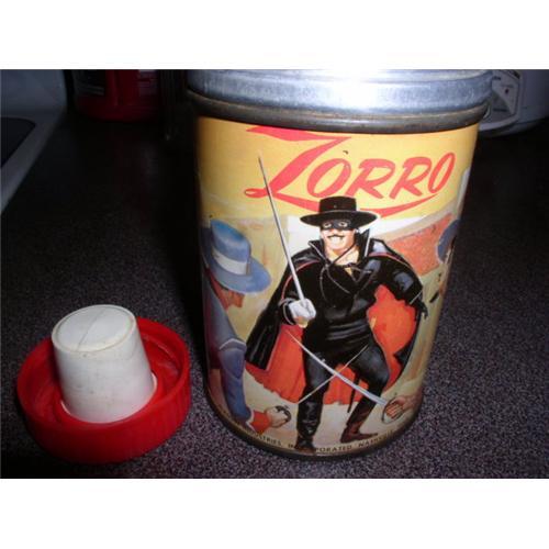 HERE'S A NICE ZORRO LUNCH BOX THERMOS MADE BY ALLADIN INDUSTRIES INC. IN 1958. THE GRAPHICS ARE EXCELLENT. THE BLACK DRINKING CUP IS MISSING. THE GLASS LINER IS INTACT AND THE STOPPER FITS VERY TIGHT. NO RUST ON THE INSIDE. BOOK VALUE $120.00