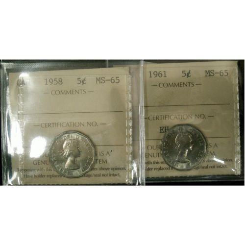 1958 and 1961 5¢ ICCS MS65. Lot of two coins