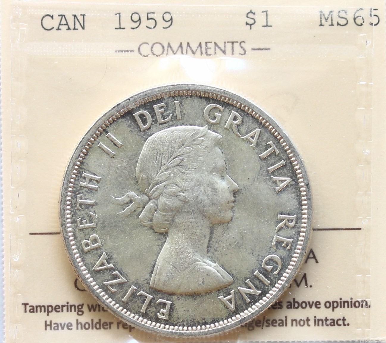 1959 $1 ICCS Gem Mint State-65. Gem issue displaying light silvery cloud appeal.