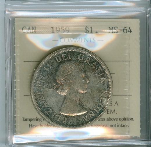 1959 $1 ICCS MS64. Speckled reddish blue tone.
