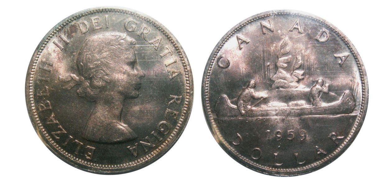 1959 $1 ICCS MS65. Gem example with scattered gold and purple tone. A very difficult issue to find in ICCS MS65. Only 2 examples graded ICCS MS65 according to the 2009 ICCS Pop report. Excluding the Arnprior and other Variety issues this is scarcest date in grade.