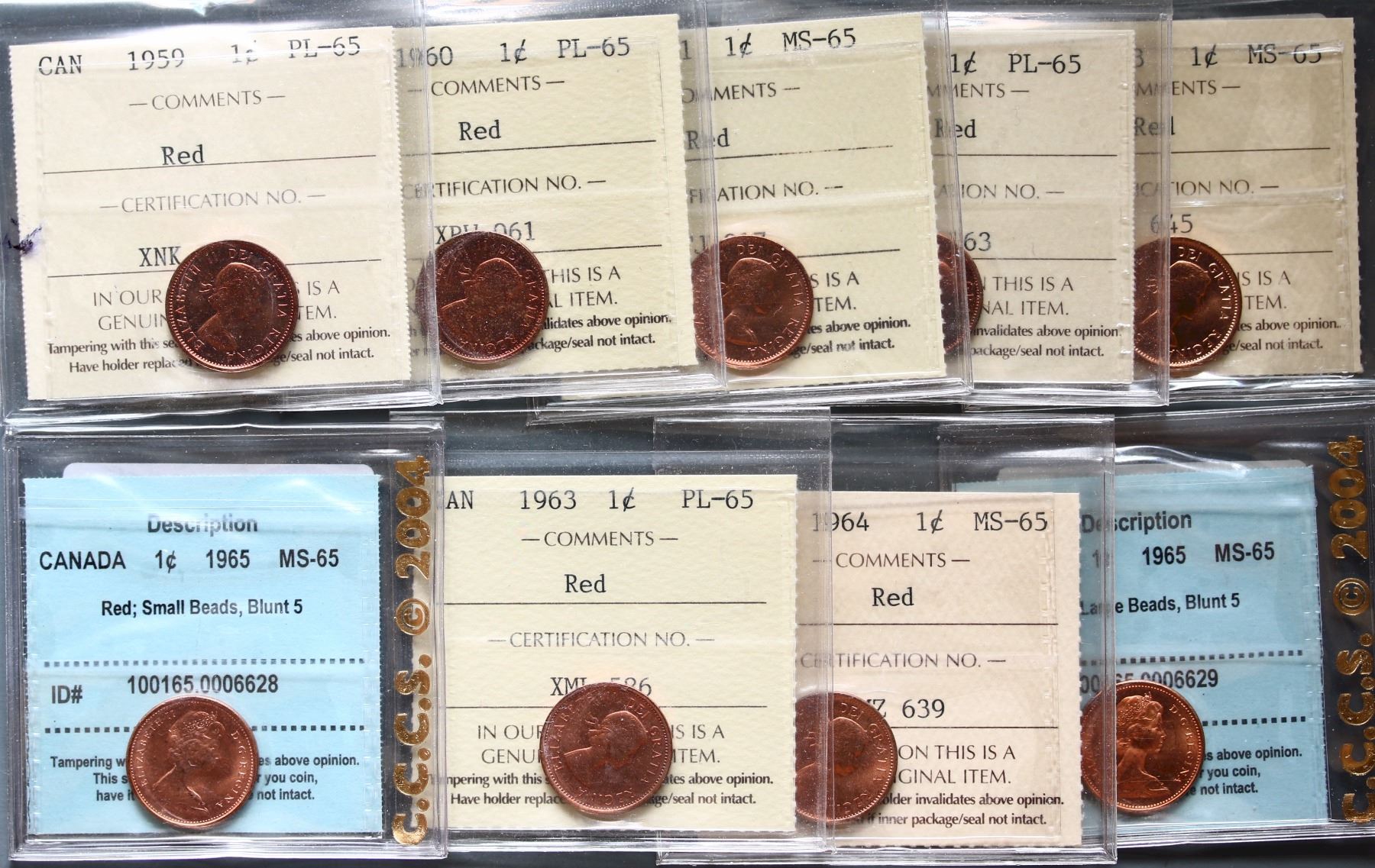 1959 1¢ to 1965 all graded Gem Mint State-65 to Gem Proof-Like-65 ICCS and CCCS. Lot of 9 coins. See Pic.
