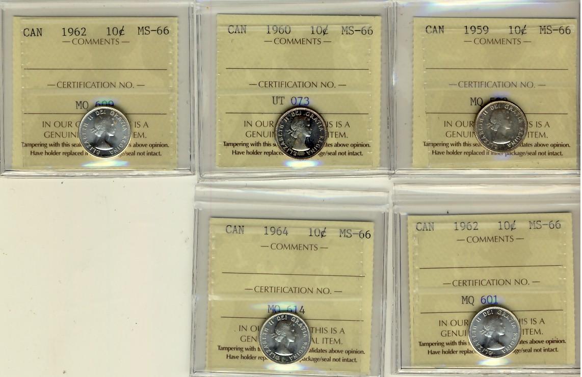 1959 10¢, 1960, 1962(2) & 1964 ICCS MS66. Lot of 5 coins.