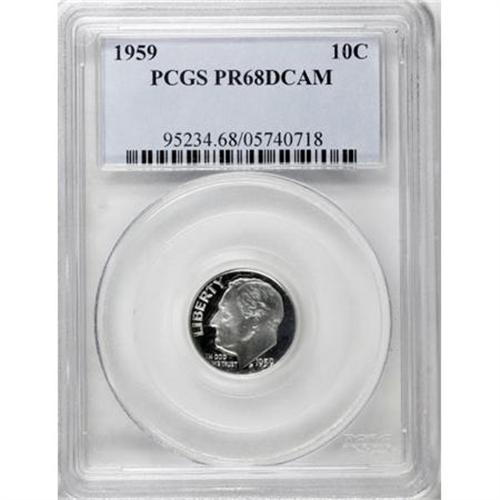 <B>1959 10C PR68 Deep Cameo PCGS.</B></I> . PCGS Population (24/3). NGC Census: (14/2). Numismedia Wsl. Price for NGC/PCGS coin in PR68: $420. (#95234)<BR><BR><b>Shipping:</b> Coins & Currency (<a target="_blank" href="http://www.heritageauctions.com/common/shipping.php">view shipping information</a>)