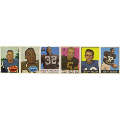 <B>1959, 1960, and 1961 Topps Football Complete Sets.</B></I> Offered here are three early Topps Football issues in complete set form with each containing Johnny Unitas as the first card in the set. The 1959 set consists of 176 cards and grades as 18% NM or better, 62% EX to EX/MT, and 20% VG/EX or lesser. The 1960 Set contains 132 cards and grades as 10% NM or better, 75% Ex to EX/MT, and 15% VG/EX or lesser. And lastly the 1961 set holds 198 cards and is in the strongest condition of the three. It grades as 32% NM or better, 62% EX to EX/MT, and 6% VG/EX or lesser. <BR><BR><B>Important notice:</B> Heritage usually auctions material at the rate of 200-250 lots per hour. On some occasions eBay Live bid software or the Internet may not be able to keep up with the pace of the auction. We recommend placing a realistic absentee bid now as insurance to avoid disappointment. Occasionally the auctioneer may eliminate or reject an eBay Live bid, and the auctioneer may also reopen a lot after the close of the eBay live bidding (usually because we missed an audience bid), and may reject your bid even if it shows you as the winning bidder. By bidding via eBay Live, you agree that Heritage may award the lot to another bidder at its sole discretion under the circumstances described above or any other reasonable circumstances. Since eBay bids are not shown to us until we open the lot on the floor, we treat those bids just like floor bids. In most cases the floor responds before the eBay bid is presented to us, due to Internet lag time, so for consistency we have made it a policy that floor bids are always considered first over tie eBay live bids. Also please note that all Heritage lots purchased through eBay Live carry a 22.5% Buyer's Premium. Please make sure you read the Terms and Conditions before you bid. This lot is being auctioned in conjunction with a live floor auction by Heritage Galleries & Auctioneers. All final auction and invoice information will be supplied by Heritage Galleries & Auctioneers, and all other information should be considered preliminary. Lot:19296 <BR><BR><B>Winning Notification and Billing:</B> After the FINAL session in this auction is complete, Heritage will send e-mail and snail mail invoices. This process normally takes several days. All final auction and invoice information will be supplied by Heritage Galleries & Auctioneers, and all other information should be considered preliminary. <BR><BR>This auction will be conducted on a live auction floor and over the Internet through eBay Live. If you choose to place an absentee bid, please take a moment to <font color='#0000ff'><u><a href='http://pages.ebay.com/liveauctions/help/before/laabsentee.html'>learn how eBay Live absentee bidding works</a></u></font><font color='#000000'>