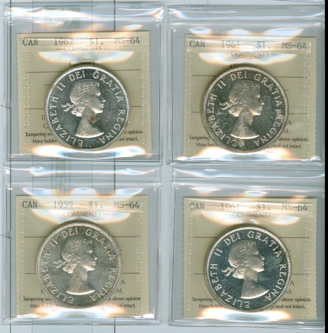 1959, 1961 (2) and 1962 $1 ICCS MS64. Lot of 4 coins.