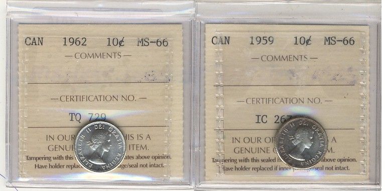 1959 & 1962 10¢ ICCS MS66. Lot of 2 coins.