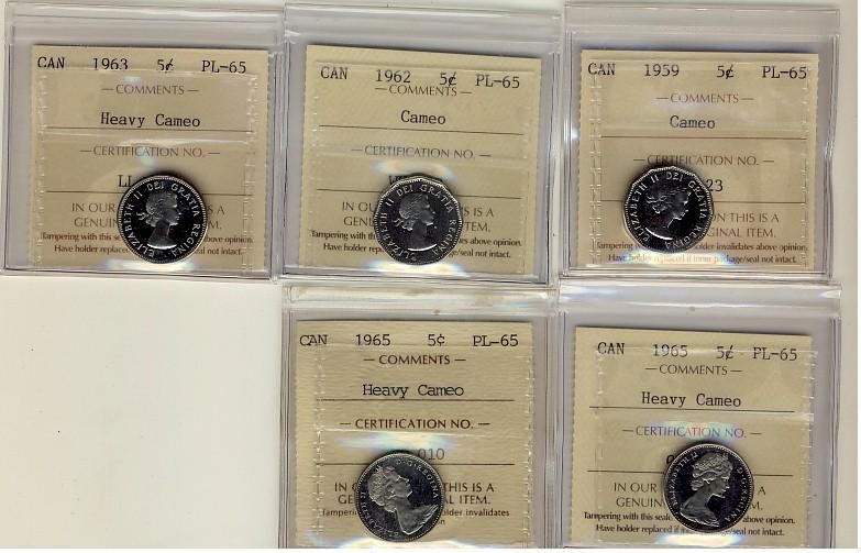 1959, 1962, 1963 & 1965(2) 5¢ ICCS PL65. Lot of 5 coins all with different Cameo designations. Cameo.