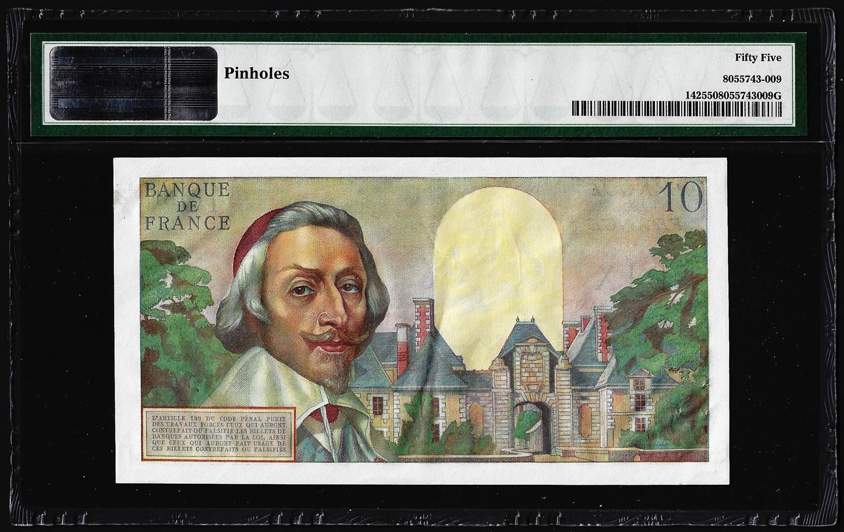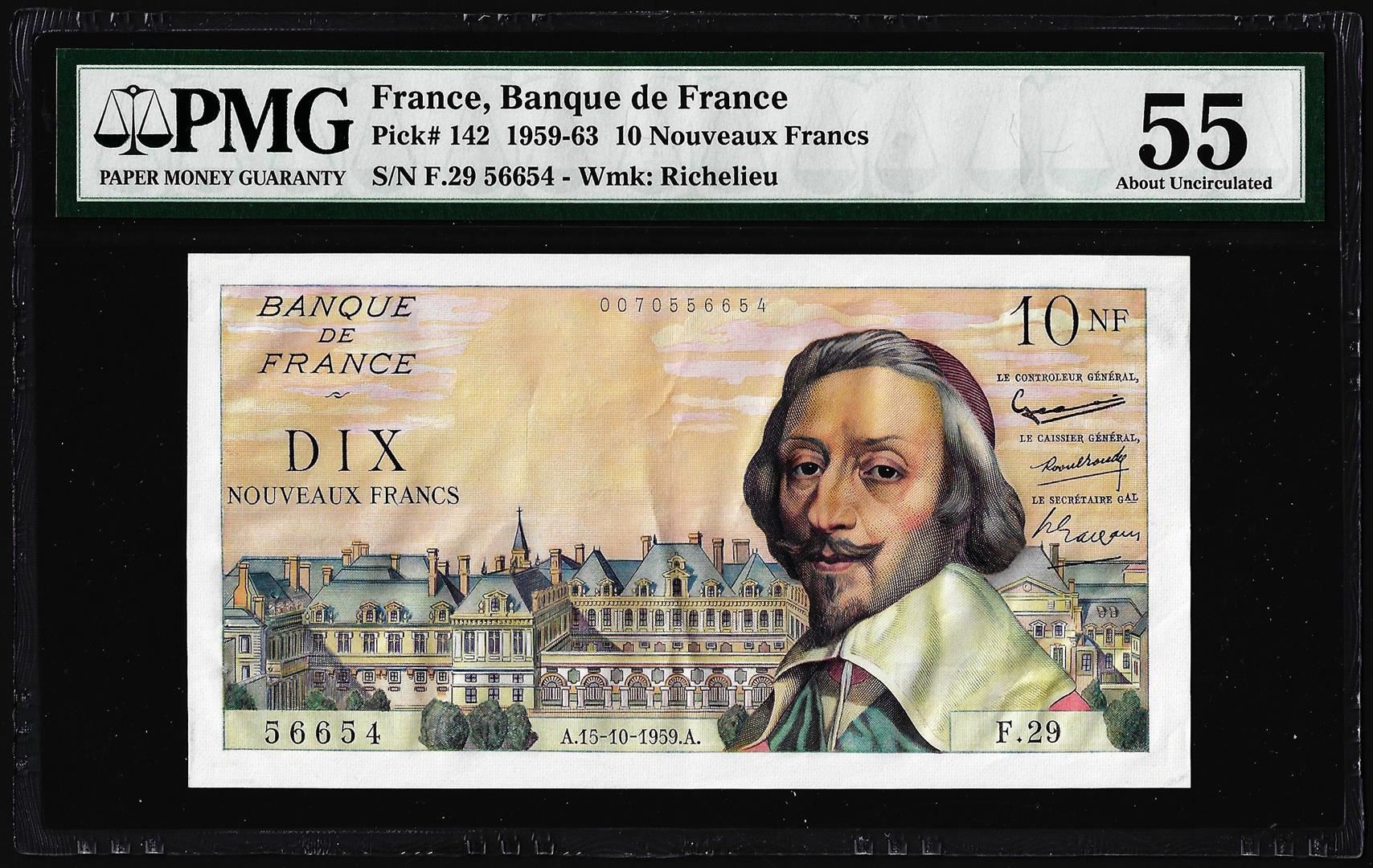 One 1959-1963 France Banque de France 10 Nouveaux Francs Note Pick# 142 PMG About Uncirculated 55. PMG Certified.