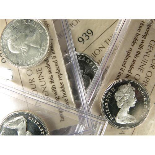 Canada Ten Cents 1959, 1960 and 1963, all ICCS MS-65. Plus 1965 ICCS PL-64 Ultra Heavy Cameo and 1966 ICCS PL-66 Cameo. Total five near untoned pieces