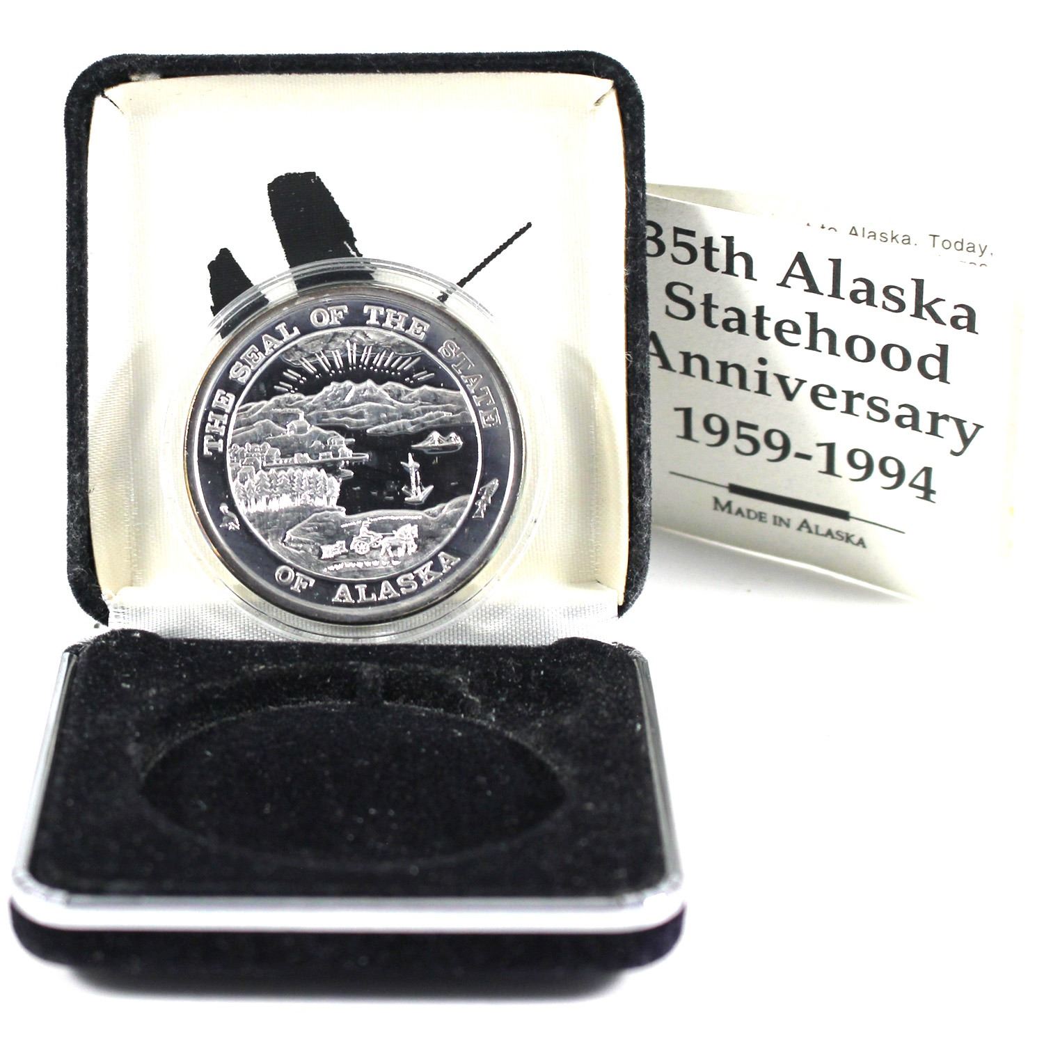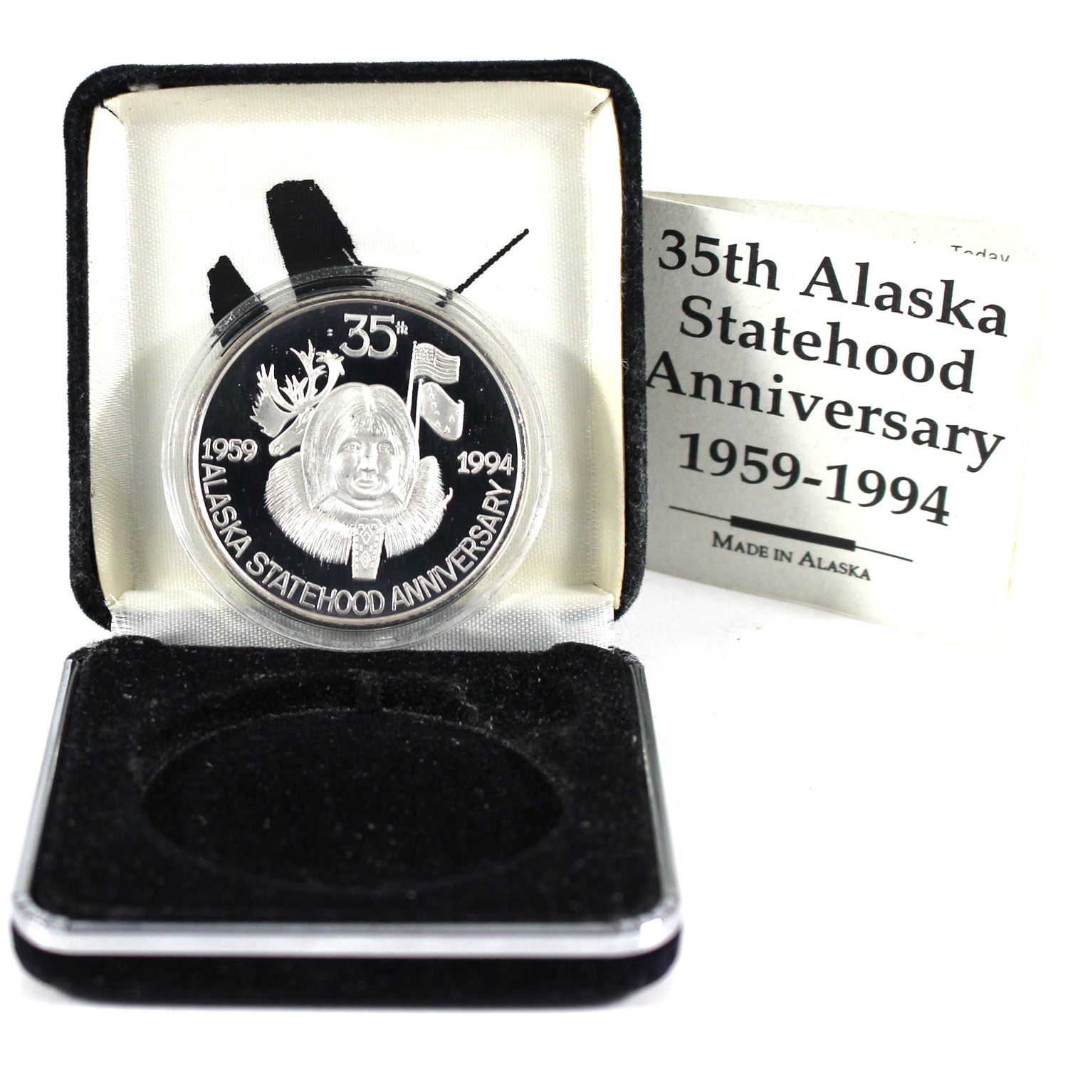 1959-1994 Alaska 35th Statehood Anniversary 1oz .999 Fine Silver Coin Encapsulated in Alaska Mint Display Box with COA (Writing in COA & coin lightly toned). TAX Exempt