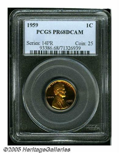 <B>1959<1C> PR68 Red Deep Cameo PCGS.</B></I> The generously frosted devices and faultless mirrors of this attractive specimen are infused with an even, deep red-orange color. There are no visible flaws or distractions of any nature on this spectacular example of the first year of issue Memorial reverse Cent. Population: 27 in 68, 3 finer (6/05).<BR><I>From The William Bickel Collection, Part One.</B></I>