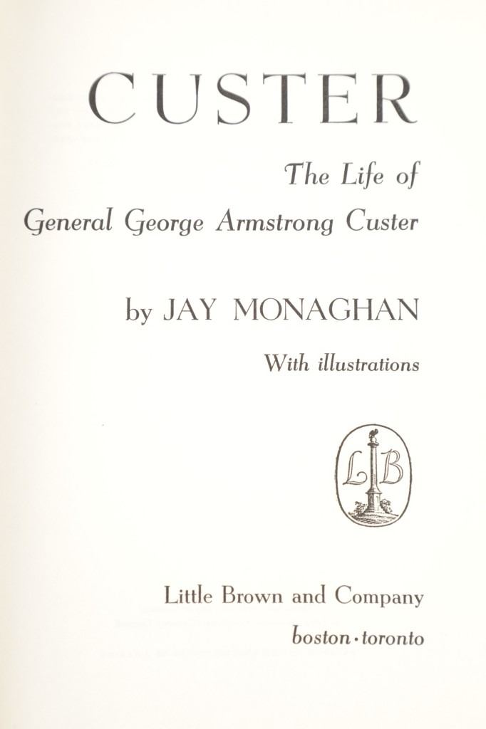 Featured in this lot is this First Edition of "Custer, The Life of General George Armstrong Custer" by Jay Managhan, 1959, Little Brown and Company publishers. The Custer literature is voluminous and most of it is highly controversial. Through the tangle of charges and countercharges Jay Monaghan cuts a clear path in his fresh account of Custer's whole career. Where possible, Monaghan relies on original sources, and he appraises them with the sound judgment of the practiced historian he is. He is sympathetic with Custer but does not hesitate to show the man's foibles and failures. He presents no attorney's brief and yet he disproves a number of ill-founded accusations. James Jay Monaghan IV (1891-1980) was known throughout his life as Jay Monaghan, the name under which he published his many works on western United States history, Abraham Lincoln and related subjects on which he was a recognized authority. He actively engaged in a life of adventure centered in the American west that he would later chronicle. During his summer breaks in 1908 and 1909, he traveled across the country, spending some of his time working on cattle roundups in Wyoming. The condition of this book is preserved with some slight fading to the cloth wrapped cover along the spine and shows some browning to the pages. The measurements of this book is 8 1/2" x 5 7/8". The collective weight of this book is 1lb 6oz.