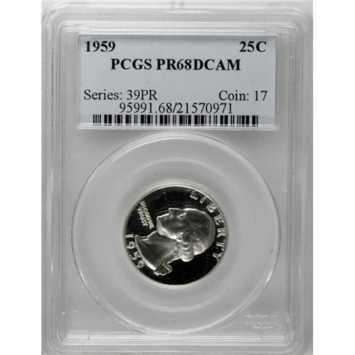 <B>1959 25C PR68 Deep Cameo PCGS.</B></I> Deeply mirrored with richly frosted devices. A lone spot of milky toning is noted to the left of the L in LIBERTY. Light scuffing is present on the back of the holder. Population: 34 in 68 Deep Cameo, 0 finer (11/06).<BR><BR><b>Shipping:</b> Coin/Currency (<a target="_blank" href="http://www.heritageauctions.com/common/shipping.php">view shipping information</a>)