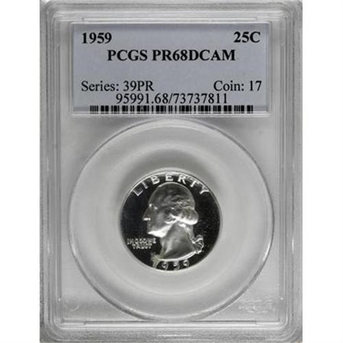 <B>1959 25C PR68 Deep Cameo PCGS.</B></I> The fields are jet-black pools of illimitable reflectivity; the devices are crisply struck and fully frosted. Not even the most trivial blemish or hairline can be found on either side of this Superb proof quarter. Population: 34 in 68 Deep Cameo, 0 finer (8/07). <BR><BR><b>Shipping:</b> Coins & Currency (<a target="_blank" href="http://www.heritageauctions.com/common/shipping.php">view shipping information</a>)