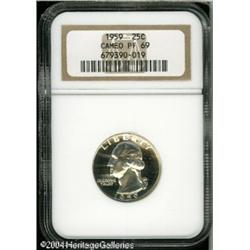 1959 25C PR69 Cameo NGC. A beautiful, immaculately <B>1959 25C PR69 Cameo NGC.</B></I> A beautiful, immaculately preserved, brilliant proof. Population: 60 in 69, 0 finer (10/04). <BR><BR><B>Important notice:</B> Heritage usually auctions material at the rate of 200-250 lots per hour. On some occasions eBay Live bid software or the Internet may not be able to keep up with the pace of the auction. We recommend placing a realistic absentee bid now as insurance to avoid disappointment. Occasionally the auctioneer may eliminate or reject an eBay Live bid, and the auctioneer may also reopen a lot after the close of the eBay live bidding (usually because we missed an audience bid), and may reject your bid even if it shows you as the winning bidder. By bidding via eBay Live, you agree that Heritage may award the lot to another bidder at its sole discretion under the circumstances described above or any other reasonable circumstances. Since eBay bids are not shown to us until we open the lot on the floor, we treat those bids just like floor bids. In most cases the floor responds before the eBay bid is presented to us, due to Internet lag time, so for consistency we have made it a policy that floor bids are always considered first over tie eBay live bids. Also please note that all Heritage lots purchased through eBay Live carry a 20% Buyer's Premium. Please make sure you read the Terms and Conditions before you bid. This lot is being auctioned in conjunction with a live floor auction by Heritage Galleries & Auctioneers. All final auction and invoice information will be supplied by Heritage Galleries & Auctioneers, and all other information should be considered preliminary. Lot:6015