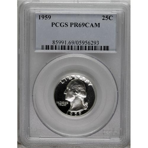 <B>1959 25C PR69 Cameo PCGS.</B></I> PCGS Population (0/0). NGC Census: (69/0). Numismedia Wsl. Price for NGC/PCGS coin in PR69: $280. (#85991)<BR><BR><b>Shipping:</b> Coins & Currency (<a target="_blank" href="http://www.heritageauctions.com/common/shipping.php">view shipping information</a>)