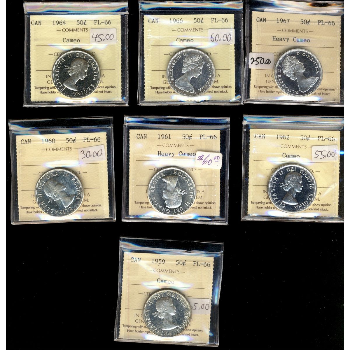 1959 50¢, 1960, 1961, 1962, 1964, 1966 & 1967 ICCS PL66. Lot of 7 coins some with Cameo to Heavy Ca