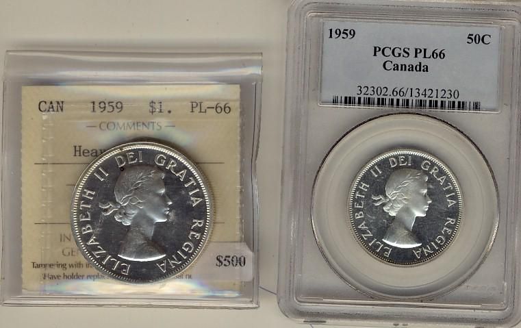 1959 50¢ PCGS PL66 with Cameo finish & 1959 $1 ICCS PL66 Heavy Cameo.