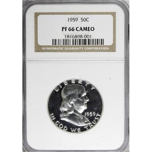 <B>1959 50C PR66 Cameo NGC.</B></I> NGC Census: (158/298). PCGS Population (125/143). Numismedia Wsl. Price: $240. (#86700)<BR><BR><b>Shipping:</b> Coin/Currency (<a target="_blank" href="http://www.heritageauctions.com/common/shipping.php">view shipping information</a>\)