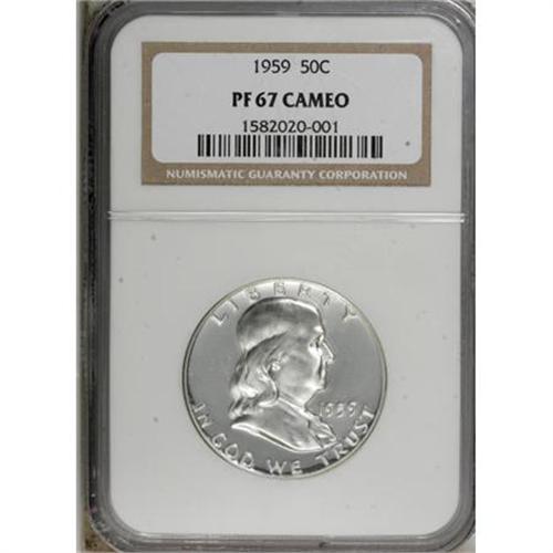 <B>1959 50C PR67 Cameo NGC.</B></I> NGC Census: (228/81). PCGS Population (121/29). Numismedia Wsl. Price for NGC/PCGS coin in PR67: $490. (#86700)<BR><BR><b>Shipping:</b> Coins & Currency (<a target="_blank" href="http://www.heritageauctions.com/common/shipping.php">view shipping information</a>)