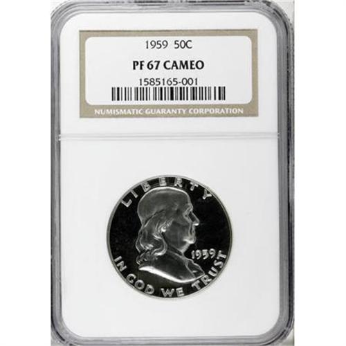 <B>1959 50C PR67 Cameo NGC.</B></I> NGC Census: (234/83). PCGS Population (127/29). Numismedia Wsl. Price for NGC/PCGS coin in PR67: $490. (#86700)<BR><BR><b>Shipping:</b> Coins & Currency (<a target="_blank" href="http://www.heritageauctions.com/common/shipping.php">view shipping information</a>)