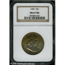 <B>1959 50C MS67 Full Bell Lines NGC.</B></I> This is the finest 1959 certified by either of the major services. Obviously not a common coin in the higher, collectible grades and especially challenging with Full Bell Lines. This is a very attractive example that exudes soft, frosted mint luster beneath the golden, lilac, and pale green toning that is seen over the surfaces. An outstanding 1959 half dollar and unique in this grade. Lot:8315