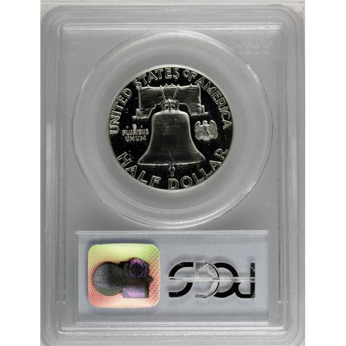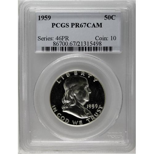 <B>1959<50C> PR67 Cameo PCGS.</B></I> Moderate contrast characterizes this specimen. Its deep mirrors create a suitable backdrop for each side's lightly frosted devices.
