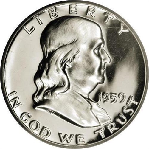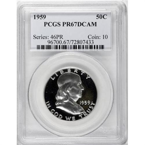 <B>1959 50C PR67 Deep Cameo PCGS.</B></I> Type Two Reverse, as on all proofs. According to Franklin half guru Rick Tomaska's <I>The Complete Guide to Franklin Half Dollars </B></I>(2002), "Despite a mintage of over 1 million proof sets, 1959 proof Franklins with significant, heavy cameo contrast on both obverse and reverse are rarely encountered. While not as rare as the 1950, 1951, or 1952 in gem cameo, in terms of the number of cameo struck as a percentage of the total proof production, the 1959 Franklin ranks #1."<BR> The present piece shows the desirable silver-on-black surfaces so desired by collectors of this difficult series, with only the most trivial distractions--a few tiny, loupe-visible-only dark flecks--possibly preventing an even finer grade. This coin is one of only a half-dozen so graded at PCGS, with two pieces finer (11/07).<BR><I>From The Kallenberg #1 PCGS Registry Set Of Proof Half Dollars.</B></I><BR><BR><b>Shipping:</b> Coins & Currency (<a target="_blank" href="http://www.heritageauctions.com/common/shipping.php">view shipping information</a>)