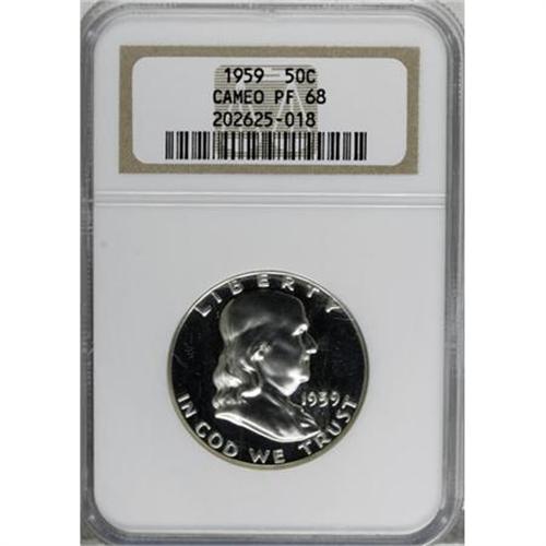 <B>1959 50C PR68 Cameo NGC.</B></I> Virtual perfection with bright silver mirrors and excellent contrast. NGC has only certified one finer piece, and no better ones have been graded by PCGS. Census: 80 in 68, 1 finer (8/07).<BR><BR><b>Shipping:</b> Coins & Currency (<a target="_blank" href="http://www.heritageauctions.com/common/shipping.php">view shipping information</a>)