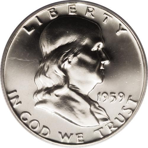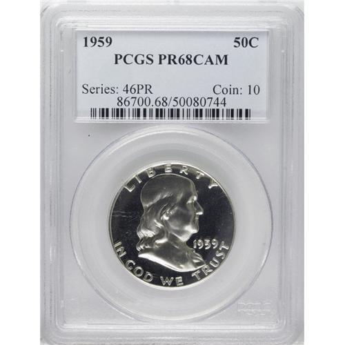 <B>1959 50C PR68 Cameo PCGS.</B></I> Boldly impressed and immensely reflective with deeply frosted and crisply struck devices. The only visible patina is a small chalk-white spot that blends with the frost on the lower bell. An unusually attractive example of this sometimes-elusive issue. Population: 29 in 68 Cameo, 0 finer (12/06).<BR><BR><b>Shipping:</b> Coin/Currency (<a target="_blank" href="http://www.heritageauctions.com/common/shipping.php">view shipping information</a>)