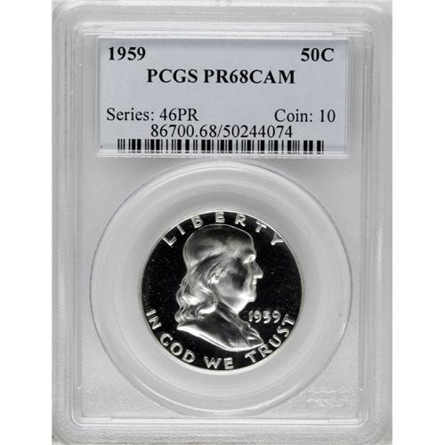 <B>1959 50C PR68 Cameo PCGS.</B></I> Outstanding brilliance emanates from both sides of this well struck cameo. When viewed from directly overhead, a white-on-black appearance is noted, as fathomless mirrored fields highlight lightly frosted motifs. Immaculate surfaces enhance the fantastic eye appeal. Population: 29 in 68 Cameo, 0 finer (1/07).<BR><BR><b>Shipping:</b> Coins & Currency (<a target="_blank" href="http://www.heritageauctions.com/common/shipping.php">view shipping information</a>)