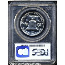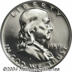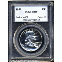<B>1959<50C> PR68 PCGS.</B></I> Fully struck and seemingly free of contact marks or hairlines, with a beautiful brilliant appearance on the obverse, and mild cameo contrast on the reverse.<BR><I>From the JFS Collection.</B></I> <BR><BR><B>Important notice:</B> Heritage usually auctions material at the rate of 200-250 lots per hour. On some occasions eBay Live bid software or the Internet may not be able to keep up with the pace of the auction. We recommend placing a realistic absentee bid now as insurance to avoid disappointment. Occasionally the auctioneer may eliminate or reject an eBay Live bid, and the auctioneer may also reopen a lot after the close of the eBay live bidding (usually because we missed an audience bid), and may reject your bid even if it shows you as the winning bidder. By bidding via eBay Live, you agree that Heritage may award the lot to another bidder at its sole discretion under the circumstances described above or any other reasonable circumstances. Since eBay bids are not shown to us until we open the lot on the floor, we treat those bids just like floor bids. In most cases the floor responds before the eBay bid is presented to us, due to Internet lag time, so for consistency we have made it a policy that floor bids are always considered first over tie eBay live bids. Also please note that all Heritage lots purchased through eBay Live carry a 20% Buyer's Premium. Please make sure you read the Terms and Conditions before you bid. </span></font></tr></table></td></tr></table>