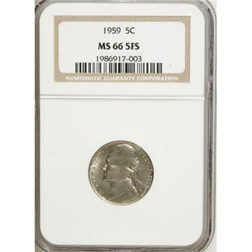 <B>1959 5C MS66 Five Full Steps NGC.</B></I> This shimmering almond-gold example is well preserved and nicely struck. Boldly brought up steps are elusive for this Eisenhower-era issue. Census: 19 in 66 Five Full Steps, 0 finer (10/07).<BR><BR><b>Shipping:</b> Coins & Currency (<a target="_blank" href="http://www.heritageauctions.com/common/shipping.php">view shipping information</a>)