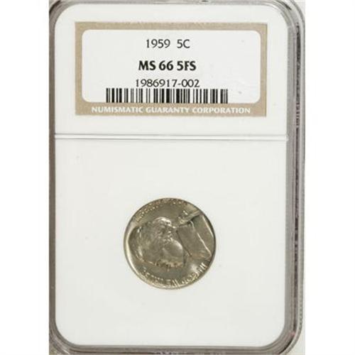 <B>1959 5C MS66 Five Full Steps NGC.</B></I> Light golden toning adorns this satiny and meticulously struck Premium Gem. The fields appear unperturbed by contact. Census: 19 in 66 Five Full Steps, 0 finer (10/07).<BR><BR><b>Shipping:</b> Coins & Currency (<a target="_blank" href="http://www.heritageauctions.com/common/shipping.php">view shipping information</a>)