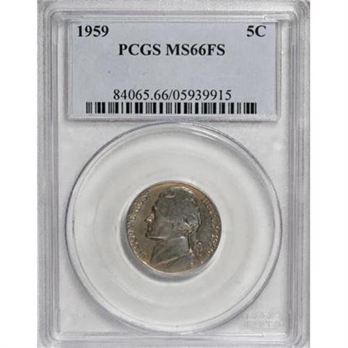 <B>1959 5C MS66 Full Steps PCGS.</B></I> Delicate mustard-gold, peach, and nickel-blue patina drapes the luminous surfaces of this sharply struck Jefferson nickel. Carefully preserved with solid eye appeal. Population: 14 in 66 Full Steps, 0 finer (1/08).<BR><BR><b>Shipping:</b> Coins & Currency (<a target="_blank" href="http://www.heritageauctions.com/common/shipping.php">view shipping information</a>)