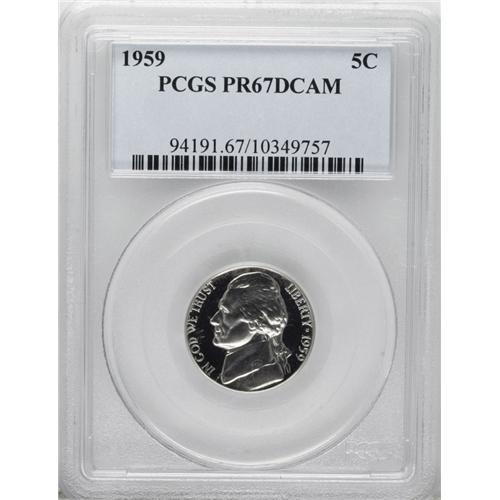 <B>1959 5C PR67 Deep Cameo PCGS.</B></I> An essentially flawless striking impression and equally superb preservation have produced this remarkable example. The frosted silver-gray devices and watery, jet-black fields create bold cameo contrast on each side.<BR><BR><b>Shipping:</b> Coins & Currency (<a target="_blank" href="http://www.heritageauctions.com/common/shipping.php">view shipping information</a>)