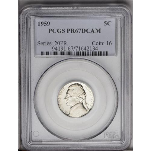 <B>1959<5C> PR67 Deep Cameo PCGS.</B></I> This Jefferson nickel is nearly unimprovable, and displays a white-on-black contrast when viewed from directly overhead. Population: 9 in 67 Deep Cameo, 10 finer (4/06).