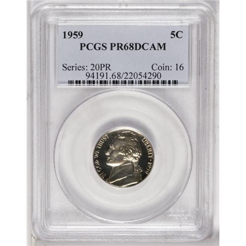 <B>1959<5C> PR68 Deep Cameo PCGS.</B></I> This razor-sharp and seemingly pristine Superb Gem exhibits light gold patina as the coin turns under a light. The dies are slightly rotated counterclockwise, quite unusual for a proof. Population: 9 in 68 Deep Cameo, 1 finer (7/06).