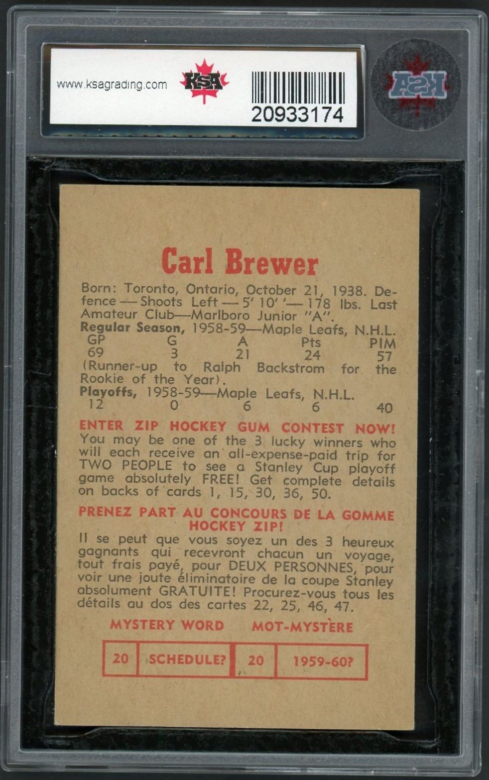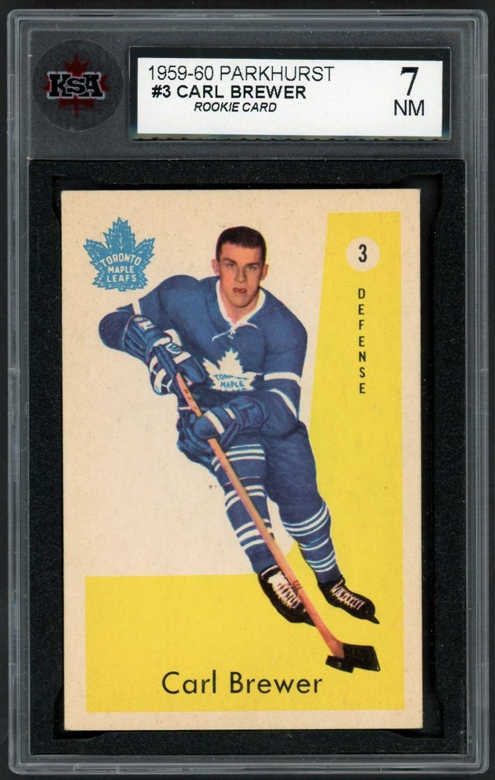 Rookie card of Carl Brewer, who was an all-star (4x), 3-time winner of the Stanley Cup, and who was instrumental in helping convict former NHLPA president Alan Eagleson of embezzlement. This one grade a solid NM 7 by KSA.