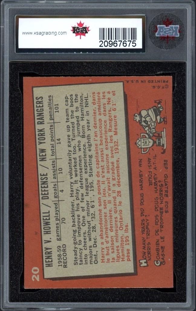HOFer, Norris Trophy winner and long-time pro, Howell played from 1952 through 1973 in the NHL and added three more seasons in the WHA, through 1976 (a total of 1,581 games). Graded 6 EX-NM by KSA.