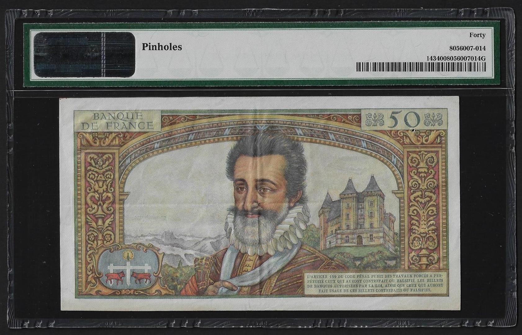 One 1959-61 France 50 Nouveaux Francs Currency Note Pick# 143 PMG Extremely Fine 40. PMG Certified.