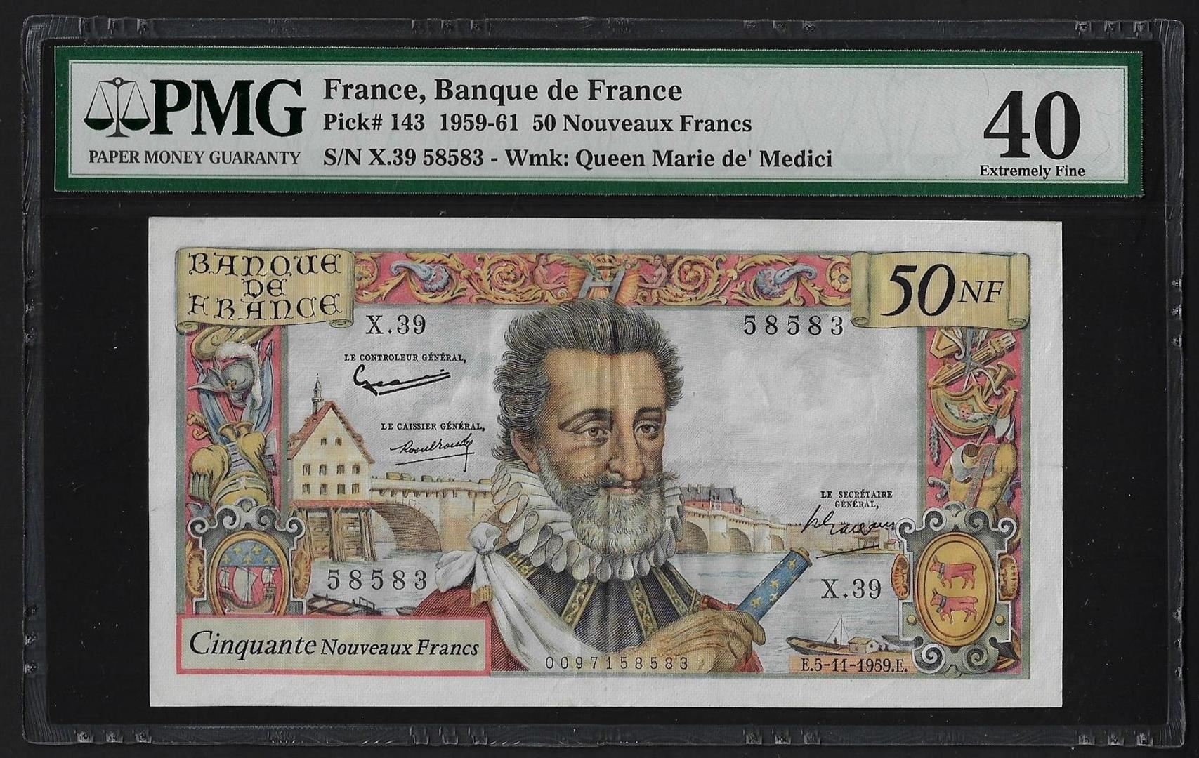 1959-61 France 50 Nouveaux Francs Currency Note Pick# 143 PMG Extremely Fine 40