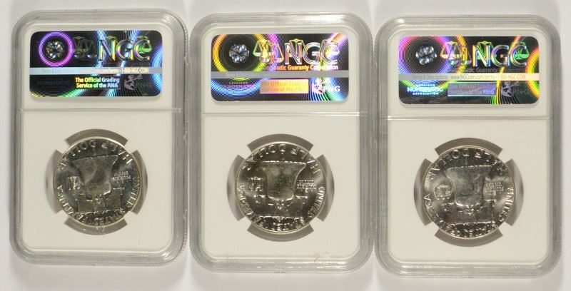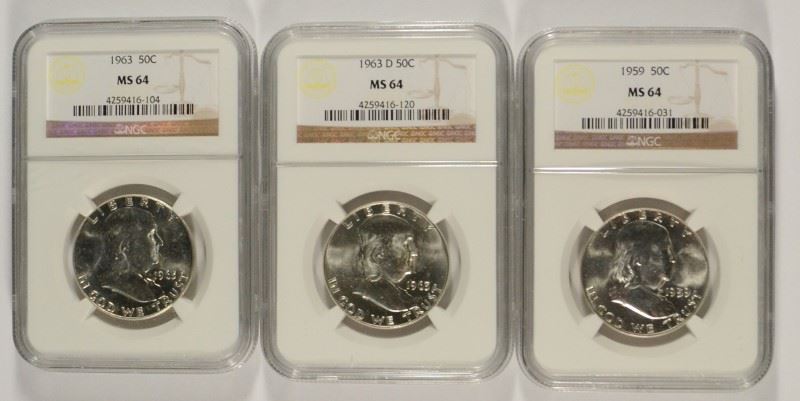 1959, 63 & 63-D FRANKLIN HALF DOLLARS, NGC MS-64